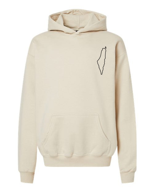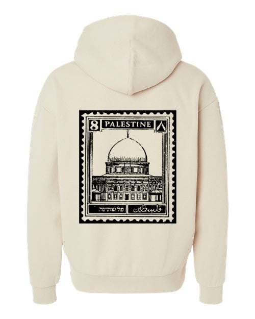 Represent your Palestinian pride in style with our Map and Stamp Edition CREAM Hoodie! This comfortable hoodie features a bold Palestinian map on the front and a unique stamp design on the back. Show off your heritage and stay cozy at the same time. Perfect for any casual day or event.